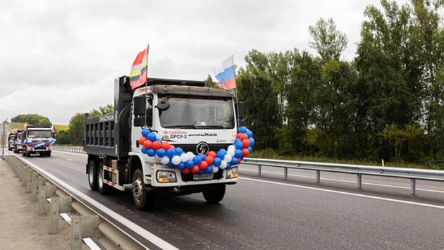 В рамках церемонии открытия по участку дороги проехало несколько грузовых автомобилей, обвязанных воздушными шариками в цветах российского флага.