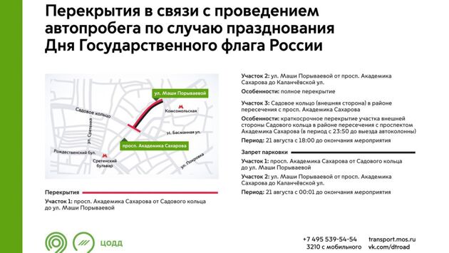 «ЦОДД: в связи с проведением автопробега 21 августа будет временно закрыт ряд улиц для движения транспорта в центре. Движение будет закрыто с 18:00 до окончания мероприятия на проспекте Академика Сахарова от Садового кольца до ул. Маши Порываевой; ул. Маши Порываевой от проспекта Академика Сахарова до ул. Каланчевская», – говорится в сообщении.