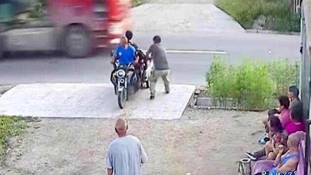 Китаец спас родственников на мотороллере от попадания под колёса грузовика
