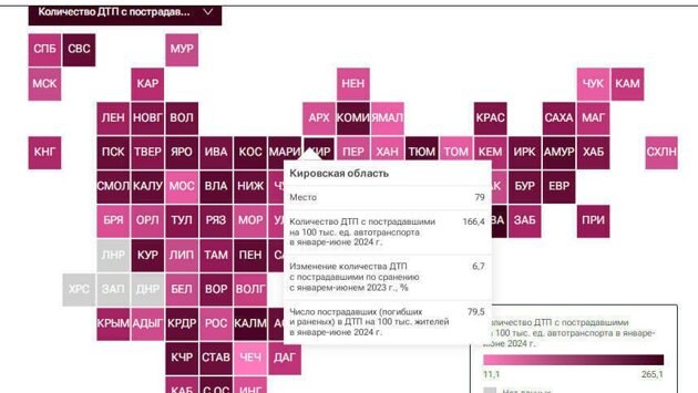 Количество дорожно-транспортных происшествий с января по июнь 2024 года в Кировской области практически равно числу аварий в аналогичный период прошлого года. Согласно данным МВД, на 100 тысяч единиц автотранспорта приходится 166,4 случаев ДТП с пострадавшими и 79,5 случаев ДТП с погибшими.