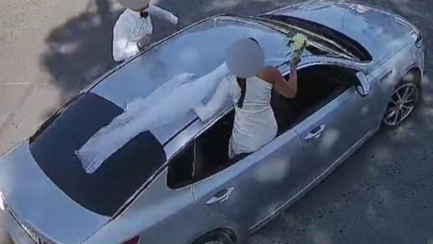 Судя по снимкам, автомобилист вез молодоженов с экстримом — новоиспеченные муж и жена уселись на открытые окна заднего сидения. Так они разъезжали по улицам, празднуя бракосочетание.