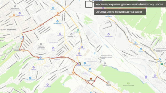 Движение автотранспорта будет осуществляться на выезд из города по ул. Видова, ул. Горького, ул. Чапаева, ул. Борисовская. Желающим въехать в Новороссийск придется воспользоваться ул. Борисовская, ул. Чапаева, ул. Горького ул. Видова, ул. Луначарского.