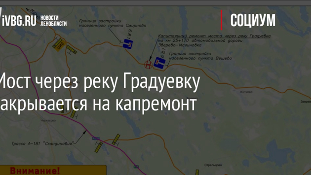 К концу недели на капитальный ремонт закроется мост через реку Градуевку на дороге между поселками Зверево и Малиновка в Выборгском районе Ленобласти. Автомобилистам придется объезжать мост по трассе «Скандинавия» и Старовыборгскому шоссе. Подробная схема ниже. Движение автобусов при этом сохранится. С двух сторон от моста были обустроены разворотные площадки и остановки, также построен пешеходный мостик.