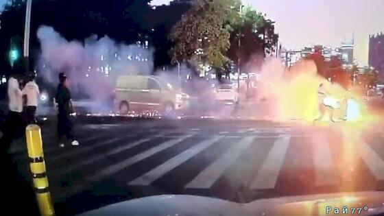 Аккумулятор двухколёсного средства передвижения воспламенился и взорвался прямо во время движения. Застигнутому врасплох владельцу скутера ничего не оставалось, как кубарем перемещаться по дорожному покрытию.