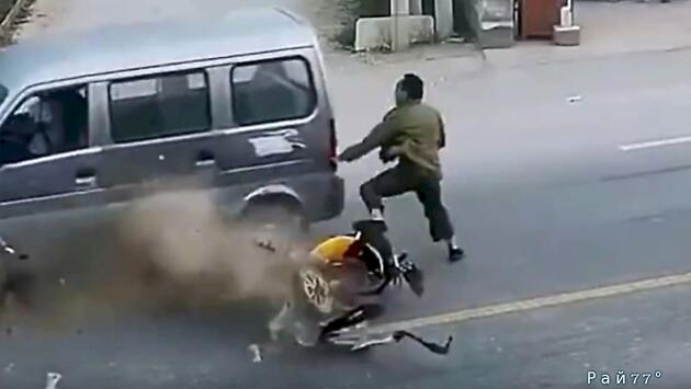 Судя по кадрам видеозаписи, молодой человек лишился своего "железного коня", но каким-то чудом не пострадал.