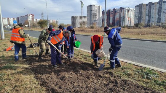 В Оренбурге в рамках осеннего месячника благоустройства и озеленения начался сезон посадок деревьев, кустарников и цветов. Второй день подряд коммунальщики работают на улице Рокоссовского, где сажают сортовые тюльпаны. Работы идут на разделительной полосе проезжей части.