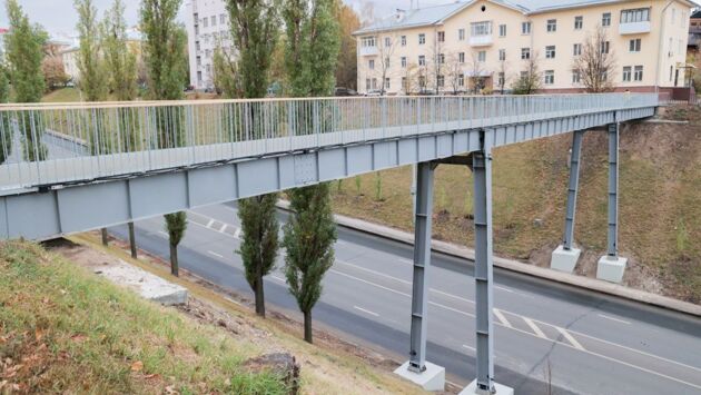 На мосту убрали старый деревянный настил, который уже деформировался, и положили новое покрытие из резиновой крошки на площади 175 квадратных метров. Полностью обновили верхнюю конструкцию моста, соединяющего улицу Заломова и Гребешковский откос. Также там смонтировали систему водоотведения и установили новое ограждение для безопасности пешеходов. Высота старого составляла 80 сантиметров, теперь она увеличена до 1,1 метра. Кроме того, были укреплены опоры моста.