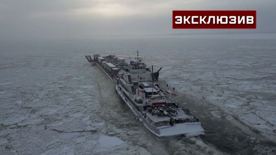 На видео телеканала «Звезда» - паром, перегруженный автомобилями. Из-за ледяной шуги судно передвигается очень медленно и вынуждено пробивать себе путь словно ледокол.