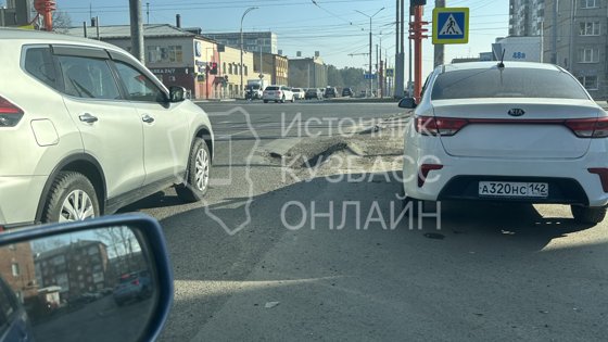 В Кемерове посреди проезжей части неподалеку от детской поликлиники образовалась большая яма.
