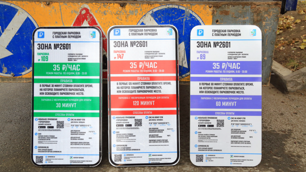 В настоящее время специалисты вывешивают новые информационные щиты. Для удобства пользователей они окрашены в разные цвета: 30 минут — зелёный инфощит, 60 минут — фиолетовый, 120 минут — красный.