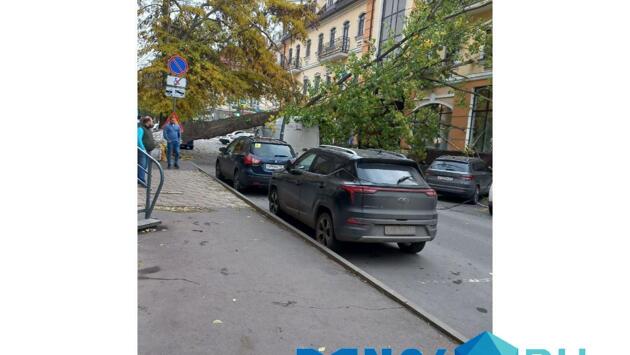 В центре Ростова дерево упало на гостиницу и придавило машину