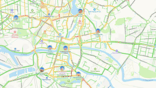 Движение затруднено на основных магистралях города. Красным горят ул. Театральная, Черняховского, Дзержинского, проспект Калинина и выезд из города по Советскому.