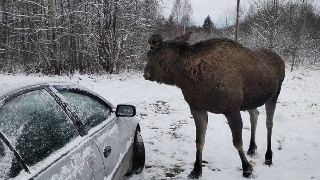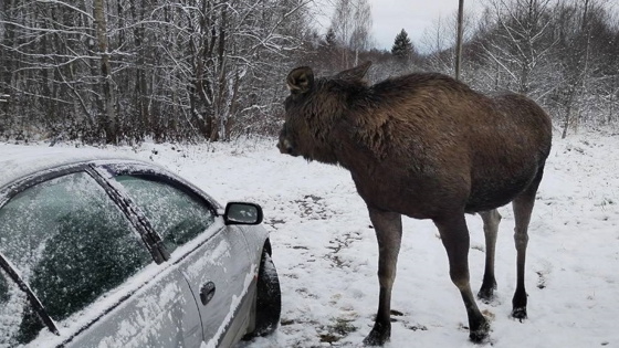 Двое мужчин прогревали машину, чтобы отправиться по делам. Увлекшись процессом, они не заметили, как к ним подошел лось. Пока люди были заняты автомобилем, любопытное животное просто стояло рядом и наблюдало за их действиями. Лось даже позволил одному из мужчин погладить себя по морде.