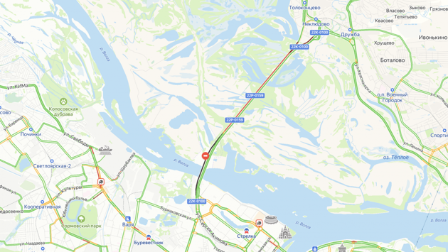 Напомним, что на старом Борском мосту сейчас идет ремонт, переправа закрыта. Движение осуществляется только по дублеру — для распределения транспортного потока там введен реверс.