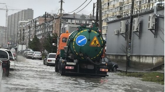 Краснодар «поплыл» после ночных дождей со снегом. На улицы вывели водооткачивающую технику с утра 24 ноября.