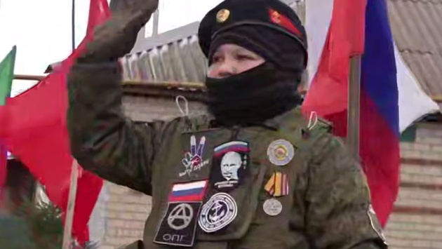 У ворот развеваются флаги: российские триколоры, боевые красные знамена воинских частей. Рядом - дощатая подставка, похожая на пост дневального в казарме. Мальчик одет в облепленный шевронами камуфляж, разгрузку и черный берет. На лице - балаклава. Все это - подарки военных, тронутых вниманием со стороны ребенка.