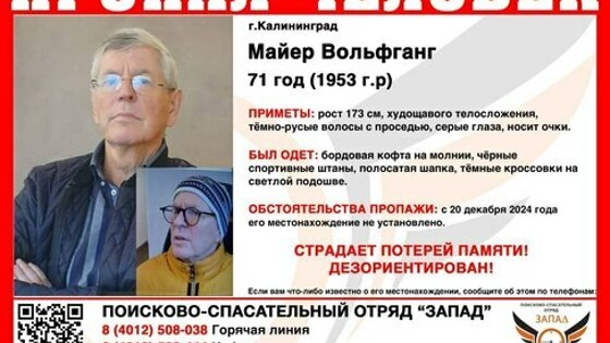 К розыску пропавшего подключились полиция и волонтёры ПСО «Запад» — близкие Вольфа очень переживают за него и надеются, что мужчину найдут живым.