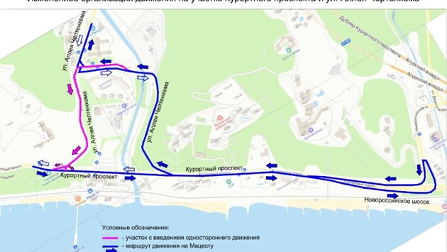 На участке улицы Аллея Челтенхема от дома №4/1 до №1/1 будет организовано двухполосное одностороннее движение: одна полоса к автодороге «Сочи-Хоста» и вторая – к улице Аллея Челтенхема.