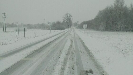 По словам водителей, спецтехники на дороге нет со вчерашнего дня. Как итог — заснеженный и скользкий асфальт.