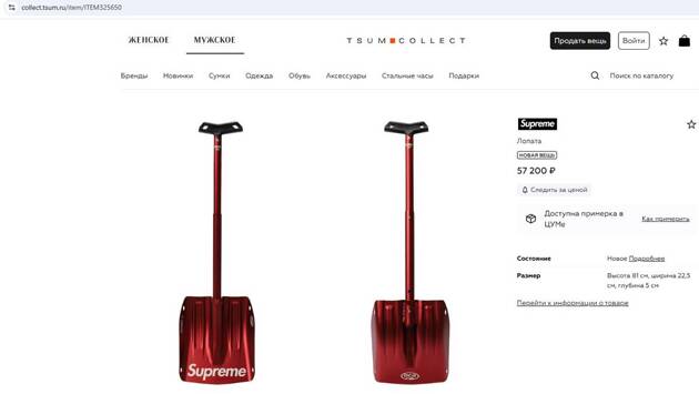 На ресейл-платформе Центрального универсального магазина (ЦУМ) TSUM Collect, предназначенной для покупки и продажи вещей класса люкс, в понедельник, 13 января, представили лопату американского бренда Supreme стоимостью 57 200 рублей.