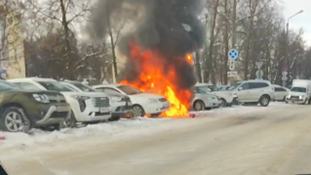 Две иномарки загорелись на парковке в Сарове Нижегородской области. Видео опубликовано в группе «Мы из Сарова | Новости Сарова».