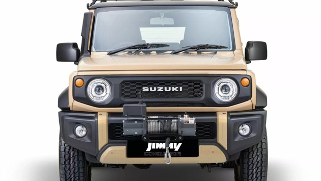 Кузов внедорожника получил специфичную окраску - это градиент матовых оттенков от бежевого до черного. А сбоку расположена большая диагональная надпись Jimny 4x4. Лицевая часть получила новую радиаторную решетку и накладки в цвет кузова. На внедорожнике установлены 16-дюймовые литые диски с вездеходными покрышками.