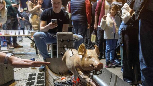 Фото сделано во время 24-часовой блокировки студентами одной из главных развязок в центре Белграда в районе Автокоманда. Такой вид приготовления свинины в Сербии является национальным и называется «пéченье».
