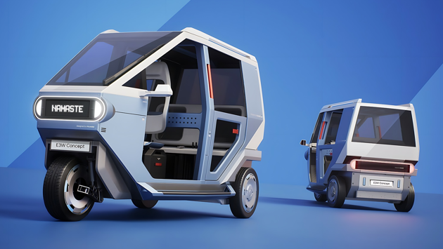Трехколесный E3W перенял черты классических рикш, но в переосмысленном виде. Спереди у концепта сильно наклоненное лобовое стекло, небольшие светодиодные фары и настраиваемое табло, на котором может отображаться любой текст. Колеса чуть больше, чем у обычных рикш; есть удобное кресло водителя с держателем для смартфона и даже буксировочный крюк.