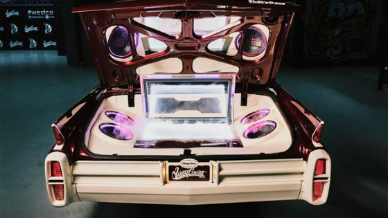 Салон автомобиля выполнили из красно-бежевой кожи, включая рулевое колесо и дверные карты. На центральной панели появился необычный держатель для рожков. В багажнике тюнеры установили подиум, в который интегрировали морозильную камеру для хранения мороженого. Вокруг постамента разместили массивные динамики со светодиодной подсветкой, а на внутренней части крышки багажника – зеркальную вставку.