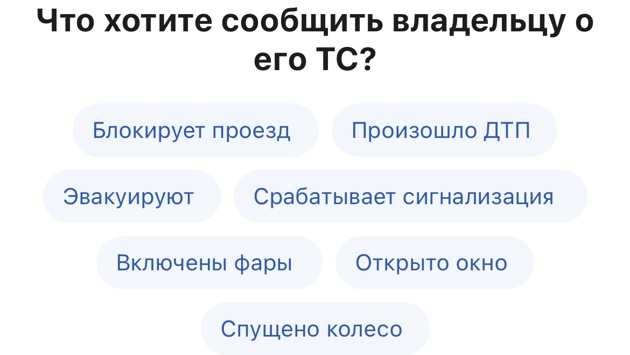 На «Госуслугах» появилась возможность отправить сообщение владельцу авто. Например, если машина мешает проезду, сработала сигнализация или произошло ДТП. 1. Чтобы написать автовладельцу, нужно пройти в приложении таким маршрутом: «Услуги» ↓ «Транспорт Права» ↓ «Сообщение о проблеме владельцу транспортного средства» 2. Откроется окно, в котором нужно выбрать сообщение для владельца машины — от «Блокирует проезд» до «Спущено колесо»: Скрин с «Госуслуг» 3. После нужно ввести госномер автомобиля. Отправитель в итоге увидит это: Скрин с «Госуслуг» А владелец машины получит вот такое уведомление на «Госуслугах»: Скрин с «Госуслуг» Все, больше ничего делать не нужно.