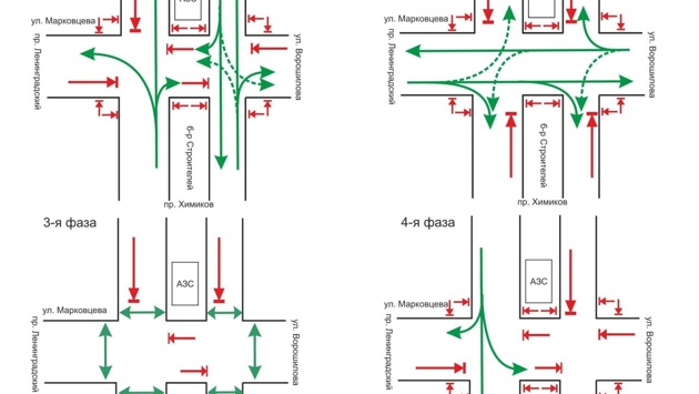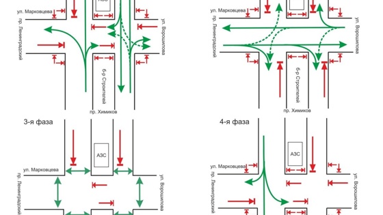 1 фаза – движение транспорта по широкой части б-ра Строителей от пр. Химиков и узкой части б-ра Строителей (оба направления); 2 фаза – движение транспорта по ул. Марковцева (оба направления); 3 фаза – движение пешеходов по всем направлениям; 4 фаза – движение транспорта по широкой части б-ра Строителей от ул. Воскресенской.