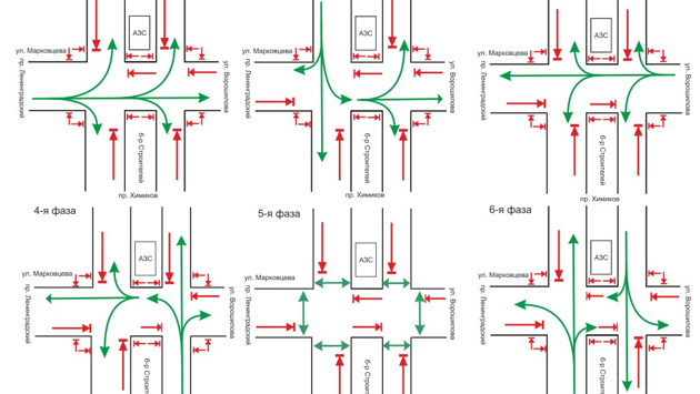 движение транспорта по улице Марковцева от проспекта Ленинградского, движение по широкой части бульвара Строителей от улицы Воскресенской и по улице Марковцева от проспекта. Ленинградского через узкую часть бульвара Строителей, движение транспорта по улице Марковцева от улицы Ворошилова, движение по узкой части бульвара Строителей от проспекта Химиков и по улице Марковцева от улицы Ворошилова через широкую часть бульвара Строителей, движение пешеходов во всех направлениях, движение транспорта по широкой части бульвара Строителей от проспекта Химиков и по узкой части бульвара Строителей от улицы Воскресенской.