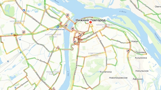 Красным отмечены улицы в центре города, все мосты и ряд важных транспортных артерий в других местах. Движение встало на проспекте Гагарина, улице Тимирязева, Белинского, Ванеева, Ошарской, Варварской, площади Минина, Окском съезде и спуске на Метромост. Частично затруднен проезд на проспекте Ленина, улице Советской и ряде других дорог.