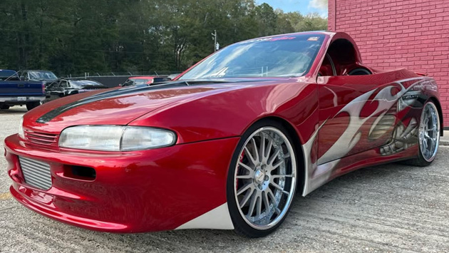 Данный Nissan 240SX выпустили в 1995 году. Спустя десятилетие спорткар попал в руки тюнерам из ателье Sound Crafters. Специалисты полностью перекрасили автомобиль, заменили кузовные панели, а также установили новые колесные диски диаметров 20 и 22 дюйма. Кроме того, машину лишили крыши, вместе которой установили узкий «перешеек», соединяющий лобовое стекло и корму. Из заводских элементов осталась лишь передняя оптика.