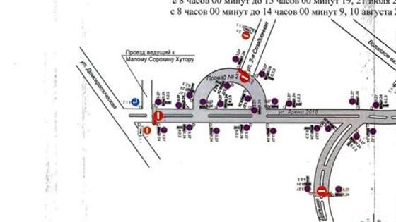 Будет ограничено движение транспорта (за исключением спецмашин полиции, скорой помощи, пожарной охраны) на следующих участках:— по ул. Арена 2018 от Проезда № 8 до поворота на проезд, ведущий к ул. Малый Сорокин Хутор;— по Проезду № 2;— по ул. Дальняя от ул. Арена 2018 на участке протяженностью 500 метров.