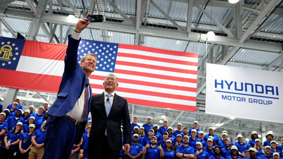 На самом деле мегазавод HMGMA заработал ещё 3 октября прошлого года, когда с его конвейера сошёл первый электрический кросс-хэтчбек Hyundai Ioniq 5, но с торжественным открытием тянули до 26 марта — вероятно, по просьбе администрации Дональда Трампа, чтобы это яркое событие немного скрасило шквал негатива в СМИ по поводу объявленных вечером того же дня 25-процентных пошлин на все импортные автомобили и ключевые комплектующие для них. На торжественное открытие съехалось всё большое начальство из Южной Кореи, в том числе исполнительный председатель Hyundai Motor Group Исон Чонг — он показан на заглавной фотографии вместе с губернатором штата Джорджия Брайаном Кемпом.