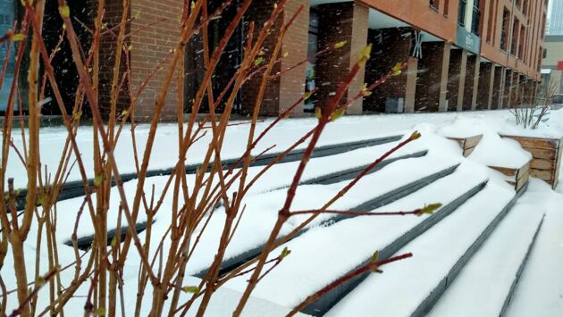 В Новосибирске в пасхальное воскресенье, 20 апреля снова был снегопад. Снег в городе идет уже третий день. Но вернувшаяся зима не может полностью скрыть признаки весны: на деревьях остаются распустившиеся почки, из-под снега выглядывает зеленая трава.