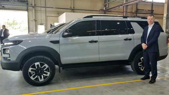 Рядом с макетом внедорожника позирует глава Центра продуктового развития Sollers Михаил Гурьянов. Как можно заметить, полноразмерный прототип в целом повторяет официальный рендер. Носовая часть такая же, как у пикапа JAC T9, но корма спроектирована заново.