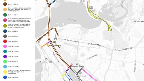В следующие выходные, 3 и 4 мая, пройдет Казанский марафон. А это значит, что снова будут перекрытия — в центре и не только. Вот схема: Схема: kzn.ru28 апреля Парковка Центрального стадиона — перекроют с 22:00 28 апреля до 22:00 4 мая30 апреля Ташаяк — от Лево-Булачной до Московской, перекроют с 15:00 30 апреля до 22:00 4 мая2 мая С 23:30 2 мая до 15:25 4 мая Ташаяк — от Московской до Саид-Галеева Московская — от ЦУМа до Ташаяк3 мая С 6:00 до 10:05 Лево-Булачная — от Ташаяк до улицы Татарстан Право-Булачная — от Пушкина до Ташаяк Кремлевская набережная — от Саид-Галеева до Батурина Кремлевская дамба Декабристов — от Кремлевской дамбы до Чистопольской Пушкина — от Островского до Лево-Булачной Татарстан — от Лево-Булачной до Московской Салимжанова — от Пушкина до Миннуллина С 6:00 до 12:45 Профсоюзная — от Чернышевского до Право-Булачной (в одном направлении) Батурина — от Большой Красной до Кремлевской набережной Площадь Тысячелетия С 10:05 до 12:45 Кремлевская набережная — от Саид-Галеева до Батурина (в одном направлении) Лево-Булачная — от Ташаяк до Тази Гиззата Право-Булачная — от Мусы Джалиля до Ташаяк4 мая С 4:45 до 9:10 Чистопольская — от Декабристов до Бичурина Чистопольская — от дома №67 до Бичурина (в одном направлении) С 4:45 до 10:00 Чистопольская — от Бичурина до Чистопольского кольца (в одном направлении) С 4:45 до 14:40 Лево-Булачная — от Ташаяк до улицы Татарстан Право-Булачная — от Пушкина до Ташаяк Кремлевская набережная — от Саид-Галеева до Батурина Кремлевская дамба Площадь Тысячелетия Декабристов — от Кремлевской дамбы до Чистопольской Батурина — от Большой Красной до Кремлевской набережной Профсоюзная — от Чернышевского до Право-Булачной (в одном направлении) С 5:30 до 10:00 Чистопольское кольцо Чистопольская — до съезда на круговое движение вокруг «Ак Барс Арены» (в одном направлении) Дорога вокруг «Ак Барс Арены» От Чистопольского кольца до Амирхана (разрешен сквозной проезд с Козина и Нигматуллина) С 5:30 до 10:40 Амирхана — от Чистопольской, 62, до Сибгата Хакима (с возможностью проезда по прилегающим дорогам-карманам) Дорога под Миллениумом — от моста до Козина и съезды в обе стороны от Вишневского до Подлужной Подлужная — от дома №67 до №78 С 5:30 до 12:35 Сибгата Хакима — от Декабристов до Амирхана С 6:15 до 14:00 Айдинова — от Салимжанова до Щербаковского переулка С 6:15 до 14:15 Салимжанова — от Пушкина до Туфана Миннуллина С 6:15 до 14:40 Пушкина — от Островского до Лево-Булачной С 6:30 до 14:00 Петербургская — от Айдинова до Назарбаева, 8 С 6:30 до 14:20 Хади Такташа — от Салимжанова до Назарбаева С 6:30 до 14:40 Татарстан — от Лево-Булачной до Московской С 6:45 до 14:20 Туфана Миннуллина — от Салимжанова до Хади Такташа С 7:00 до 14:20 Марджани — от Назарбаева до Сафьян Сафьян — от Марджани до Каюма Насыри С 7:00 до 14:40 Назарбаева — от Хади Такташа до Марджани (две правые полосы) Татарстан — от Тукая до Московской (в одном направлении) С 7:15 до 14:40 Каюма Насыри — от Сафьян до улицы Татарстан Марджани — от Сафьян до улицы Татарстан *** В этом году Казанский марафон выпал на четырехдневные выходные. Следующая за ним рабочая неделя станет такой же суперкороткой. Июнь тоже будет богат на выходные. Зачем мы все это пишем? Чтобы подсластить новость о перекрытиях.