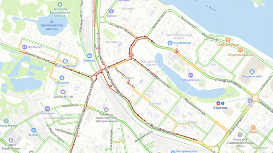 Автомобилисты стоят на улицах Бурнаковской, Сергея Акимова, Акмолинской и Мещерском бульваре. Затор образовался и на съезде с Борского моста.