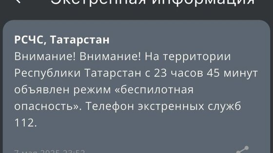 В Татарстане с 23:45 мск 7 мая объявили режим "Беспилотная опасность". Об этом говорится в приложении МЧС.