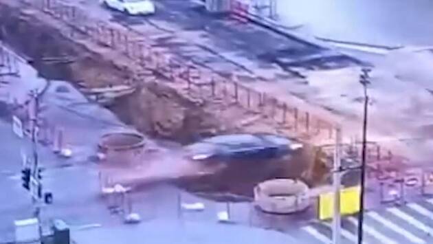 На кадрах видно, как иномарка пробила ограждение, запрещающее въезд из-за дорожных работ, и пролетела через котлован.