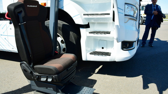 Основой послужил грузовик с автоматизированной коробкой передач, но педалей нет: управление реализовано на руле. Вопрос попадания в высокую кабину тягача КамАЗ решил с помощью специального устройства: из салона со стороны пассажира выдвигается балка с зафиксированным креслом. Управляется механизм с пульта, процесс занимает несколько секунд.