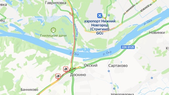 Предположительно, пробка образовалась из-за ДТП. Как сообщают пользователи, авария произошла в районе Доскинской промзоны.