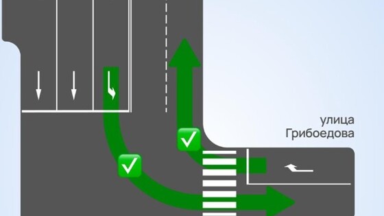 На пересечении с ул. Грибоедова появится дополнительная крайняя левая полоса для поворота, а выезд с Грибоедова на Дзержинского будет разрешен только направо — в сторону ТЦ «Красная Площадь». На перекрестке с улицей Сафонова также добавят левую полосу для поворота.