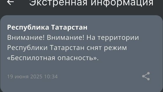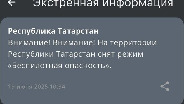 В Татарстане сняли режим "Беспилотная опасность". Соответствующее сообщение появилось в приложении МЧС в 10.34 по московскому времени.