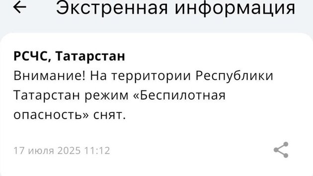 В Татарстане отменили режим "Беспилотная опасность". Об этом сообщили в приложении МЧС.
