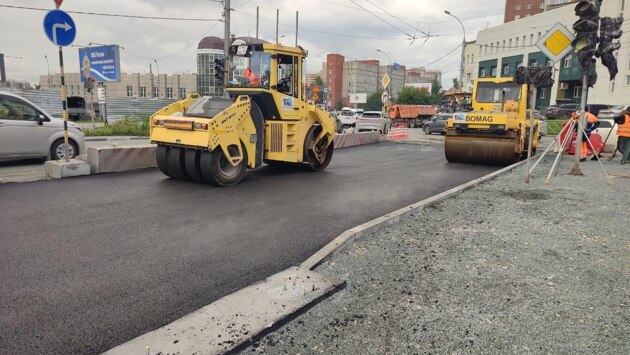 На левой части путепровода на Фрунзе в Новосибирске идёт укладка асфальта
