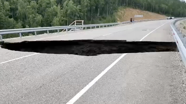 Вечером во вторник на участке между Соловьевском и Тындой образовалась огромная дыра во всю ширину дорожного полотна. Вскоре с обеих сторон провала начали скапливаться грузовые и легковые автомобили.