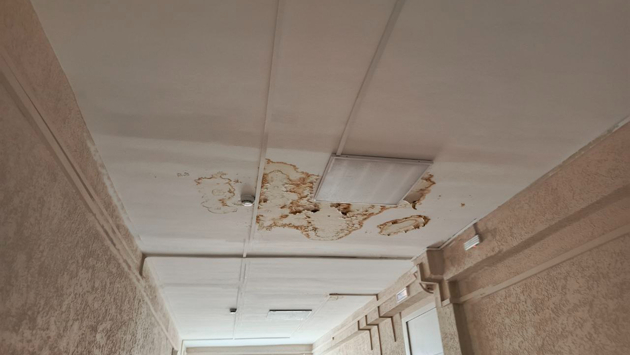Сообщается, что в этом году при эксплуатации отремонтированной крыши снова возникли протечки, об этом сигнализируют потеки на потолке.